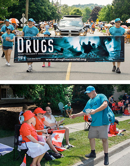 Daarom deden 15 DFW-vrijwilligers mee met de Cambridge Canada Day Parade, met een spandoek waarop stond “De Feiten Over Drugs: wat je niet weet kan je doden”. Ze liepen met andere humanitaire organisaties en families terwijl ze door de straten van Cambridge paradeerden. Ze deelden de hele tijd De Feiten over Drugs boekjes uit aan de meer dan 7000 aanwezigen, en vooral aan jongeren. Na de parade hadden de DFW-vrijwilligers een kraampje met nog meer materialen voor de inwoners, en een springkussen en een barbecue voor gezinnen om deze dag op de juiste manier te vieren.
