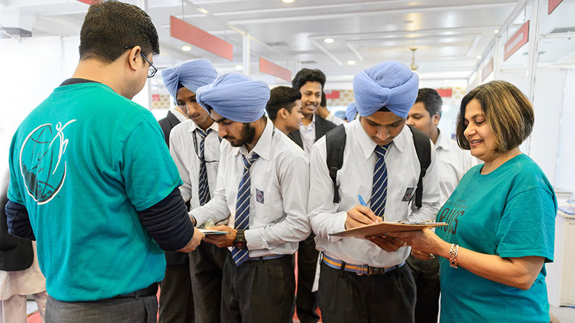 Vasu Yajnik-Setia (rechts) en leden van haar 31 afdelingen lichten India voor over de feiten over drugs in 19 staten, zoals hier bij de Sikh Loopbaanbegeleidingsbeurs.