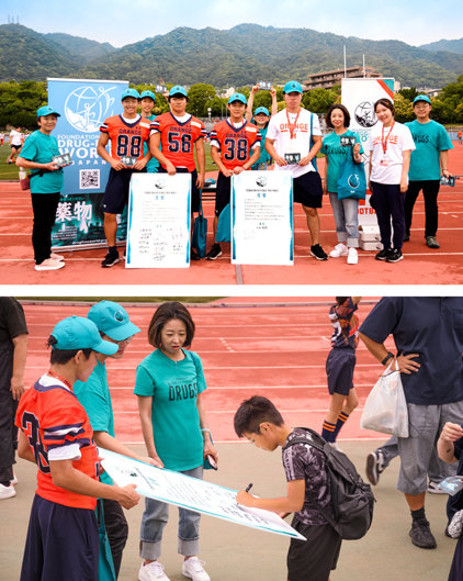 Hun eerste grote actie vond plaats in de beroemde Koshien Bowl – de jaarlijkse kampioenswedstrijd van het Japanse collegefootball – waar DFW-vrijwilligers duizenden Feiten over Drugs-boekjes uitdeelden. Bezoekers bedankten hen en zeiden: “Laten we samen football beschermen.”